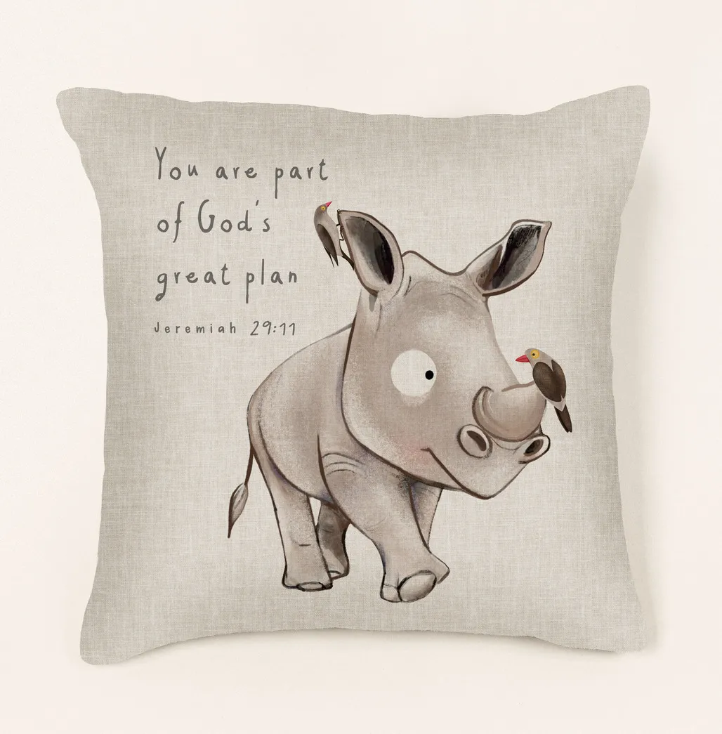 Rest in divine purpose with this “You are part of God’s great plan” rhino cushion featuring Jeremiah 29:11. The gentle watercolor style and encouraging message remind us that our lives have meaning and direction in God’s loving hands. Perfect for those seeking reassurance in their journey.