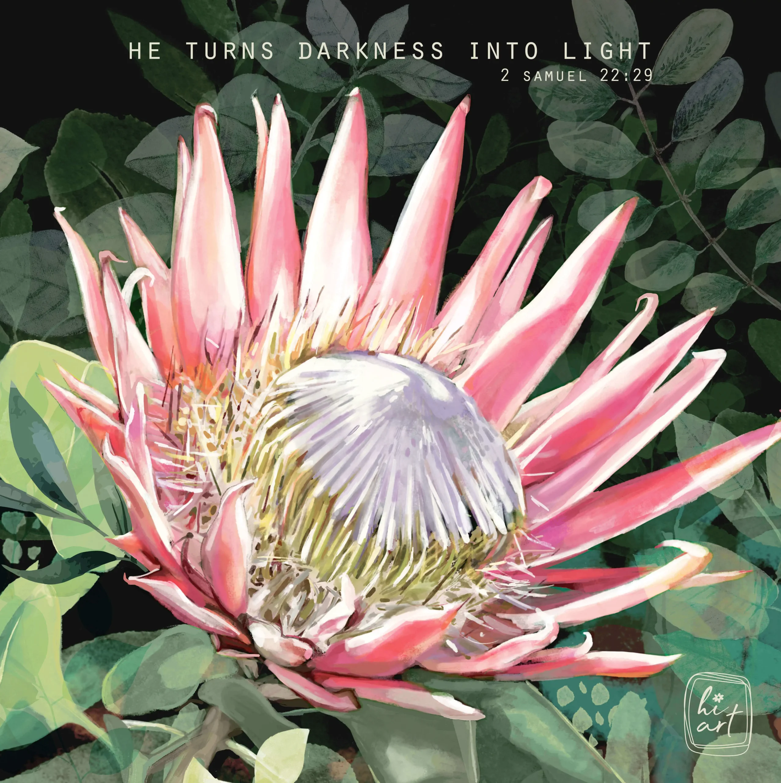 Find hope in God’s transforming power with this king protea artwork featuring 2 Samuel 22:29 – “He turns darkness into light.” The dramatic pink and white protea against deep green foliage symbolises how God brings beauty from difficult seasons, making this piece perfect for spaces where you need encouragement and hope