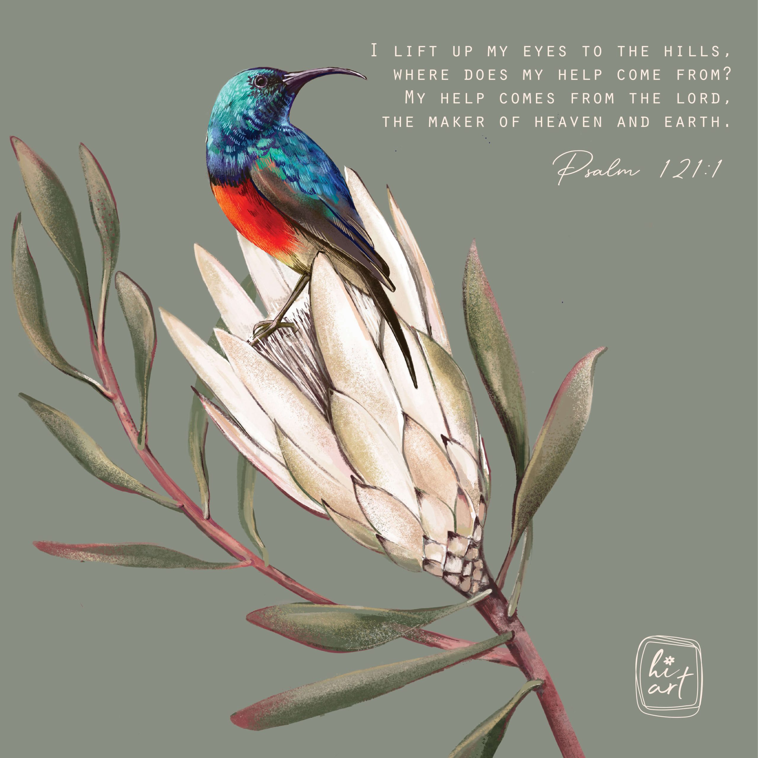 Find strength and help with this protea artwork featuring Psalm 121:1 – “I lift up my eyes to the hills, where does my help come from? My help comes from the Lord, the Maker of heaven and earth.” The elegant protea bloom reminds us to look up to our faithful God in times of need