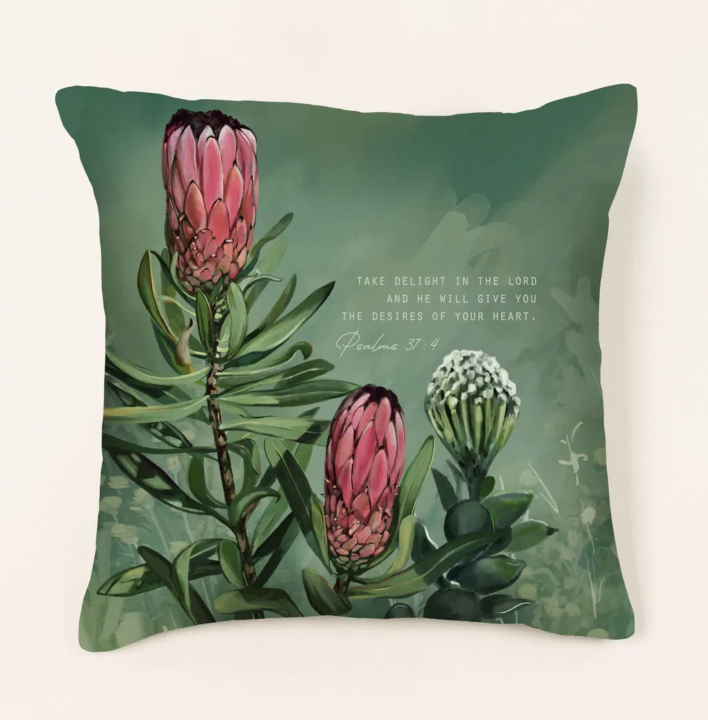 Find comfort in God’s faithfulness with this protea cushion featuring encouraging words about His constant presence and unwavering love. The rich green tones and elegant protea design create a sophisticated piece that speaks peace and assurance to your heart and home.