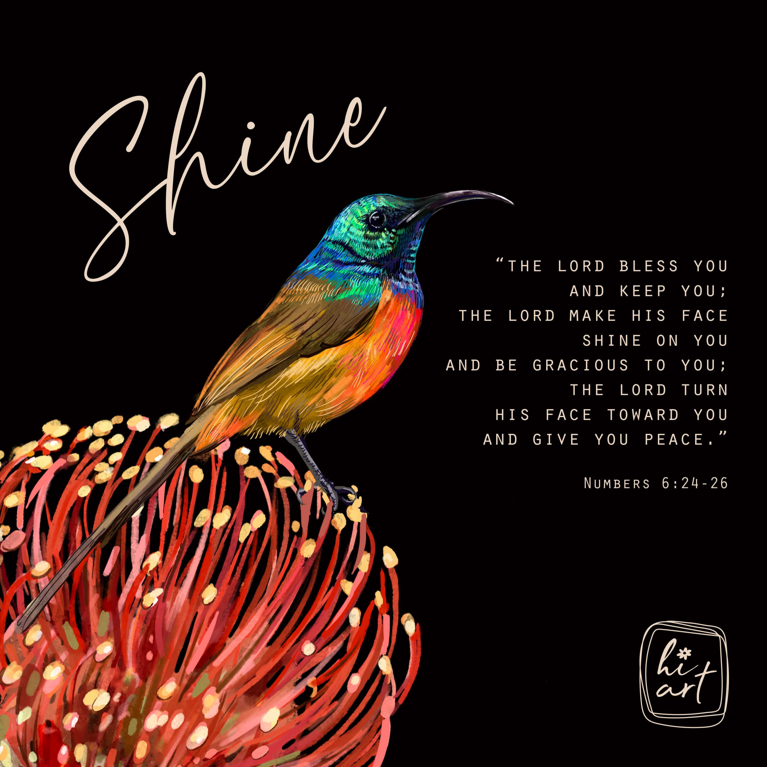 Let your light shine with this vibrant “Shine” sunbird artwork featuring Numbers 6:24-26. “The Lord bless you and keep you; the Lord make his face shine on you and be gracious to you; the Lord turn his face toward you and give you peace.” This radiant piece celebrates God’s blessing and favor.
