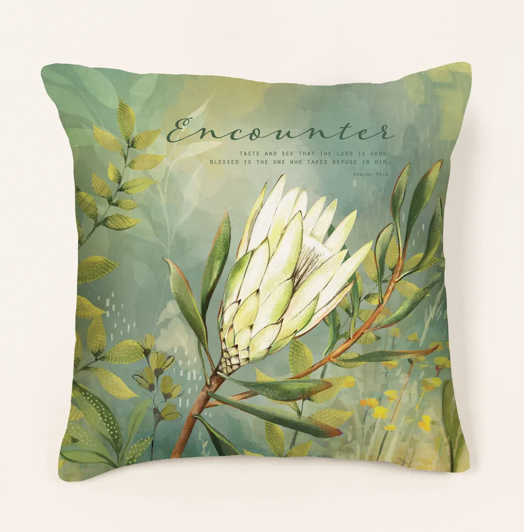 Seek divine encounters with this “Encounter” protea cushion featuring Jeremiah 29:13 – “You will seek me and find me when you seek me with all your heart.” The soft watercolor protea creates a peaceful atmosphere for prayer and reflection on God’s faithful presence.