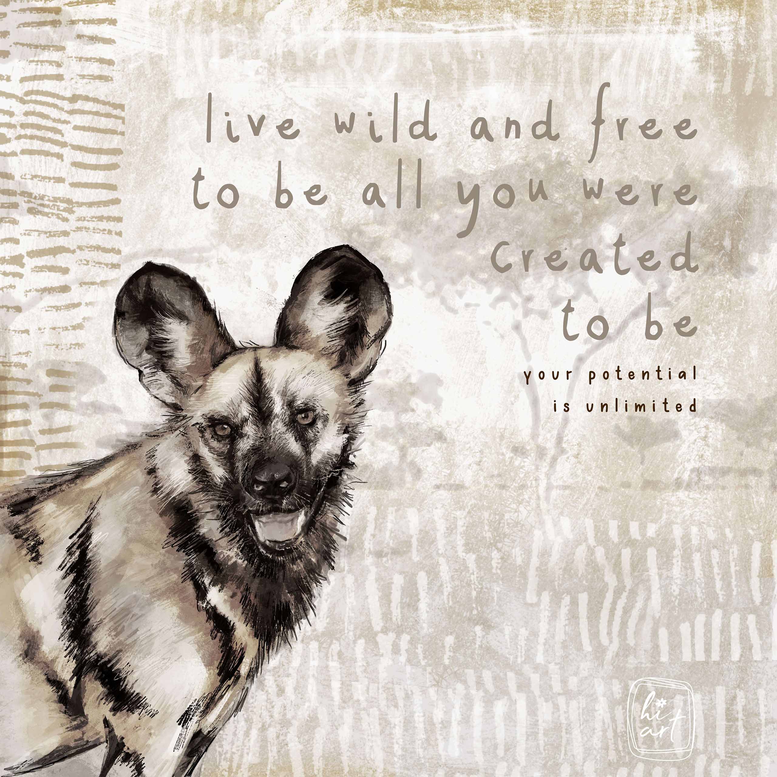 Embrace your authentic self with this wild dog artwork featuring “Live wild and free to be all you were created to be” and “your potential is unlimited.” The alert and confident wild dog encourages you to step fully into who God designed you to be, without holding back or conforming to others’ expectations. Perfect for celebrating your unique calling and unlimited possibilities.