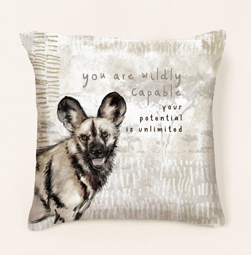 Embrace your unlimited potential with this “You are wildly capable” wild dog cushion. The encouraging message reminds us that our potential is boundless when we trust in God’s plan for our lives. This unique African wildlife design brings both inspiration and natural beauty to your space.